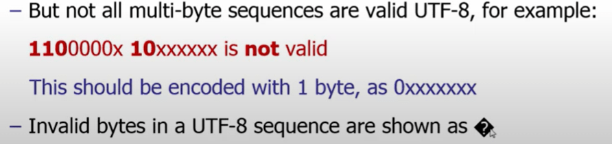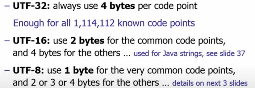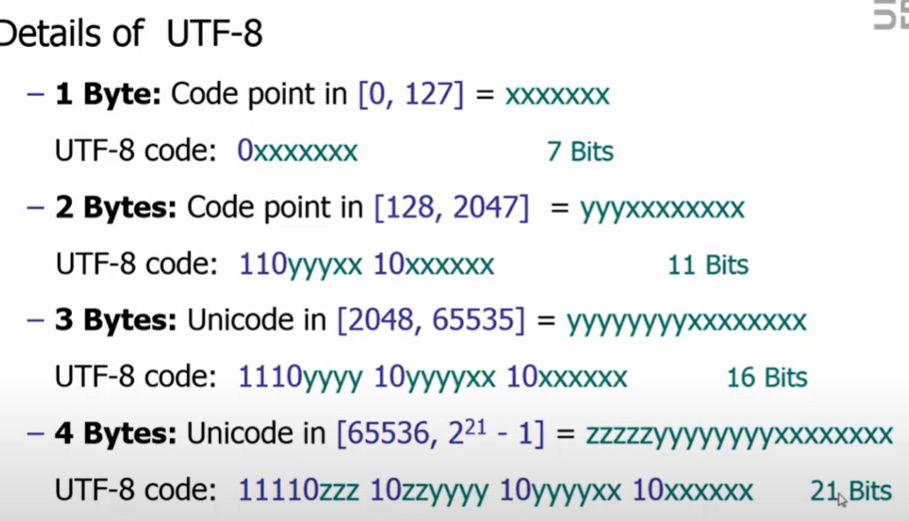 UTF-8 was another system for storing your string of Unicode code points, those magic U+ numbers, in memory using 8-bit bytes. In UTF-8, every code point from 0-127 is stored in a single byte. Only code points 128 and above are stored using 2, 3, in fact, up to 6 bytes.
