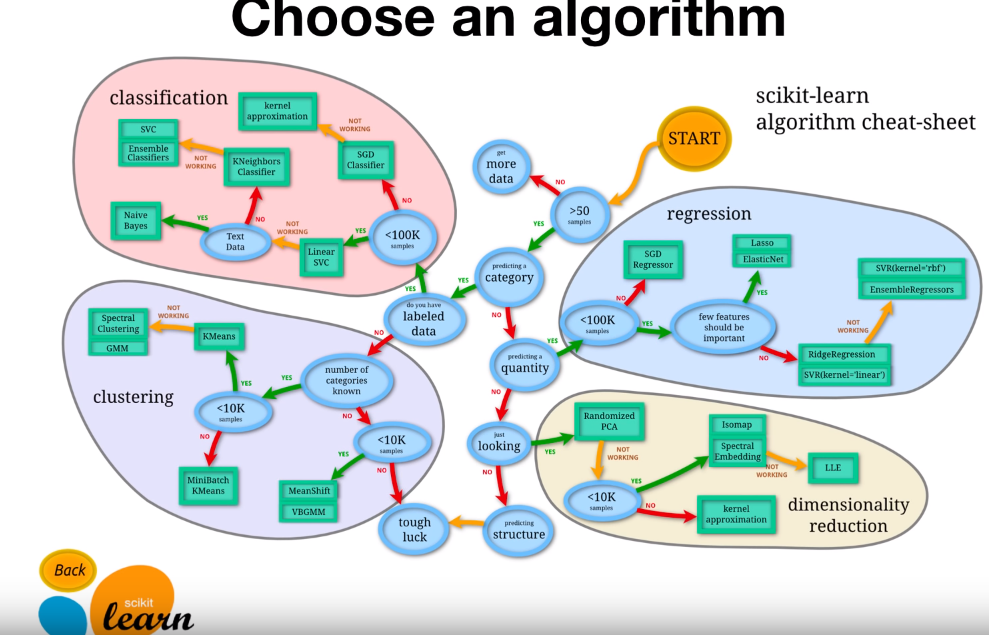 The next big step is to choose the right algorithm or estimator to conduct machine learning. Jake has listed the following on his website: