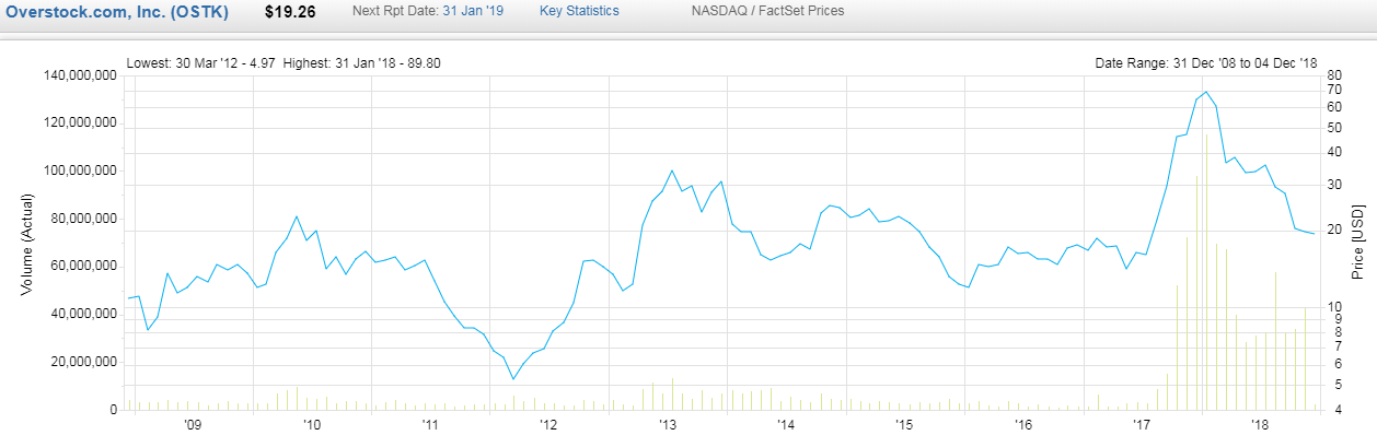 Skimming through companies that are not significantly exposed to blockchain, but reporting tradenames, no particular big companies jumped out. It’s worth pointing out that Overstock, a ballooned-up online furniture company, speculated in Bitcoin game last year, has the following price performance. After the fake height in 2017, it’s crashed to the prior level.