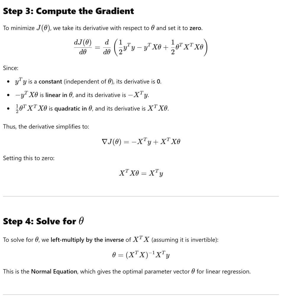 The key theory is to minimize the cost function composed of m samples labeled with n features (in matrix form), and gradient descent is used to construct this cost function. However, Professor Ng first described “normal equations” as