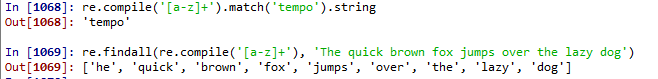 re.findall(re.compile(‘[a-z]+’), ‘The quick brown fox jumps over the lazy dog’)
