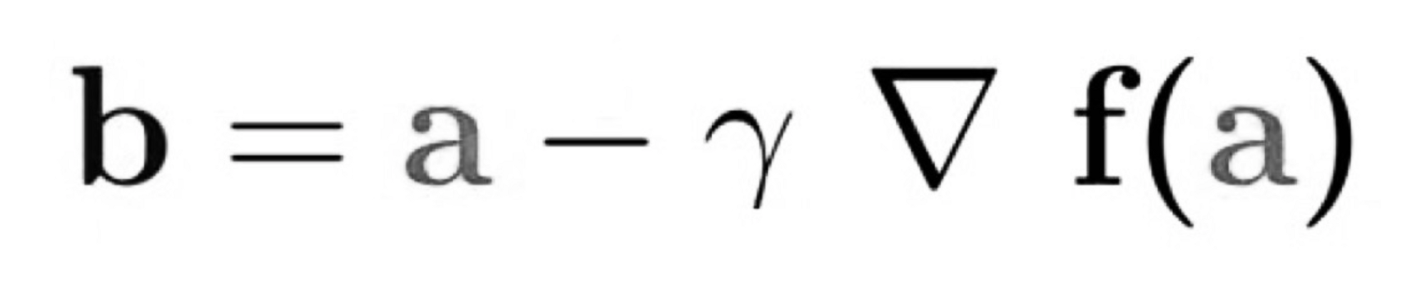 b“ describes the next position of our climber, while „a“ represents his current position. The minus sign refers to the minimization part of gradient descent. The „gamma“ in the middle is a waiting factor and the gradient term ( Δf(a) ) is simply the direction of the steepest descent.