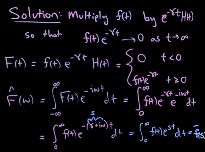 As shown below, Fourier Transform has its limitation, so the ingenuity of Laplace is to compose f(t) with an exponentially decay function and heavy-sided function together,