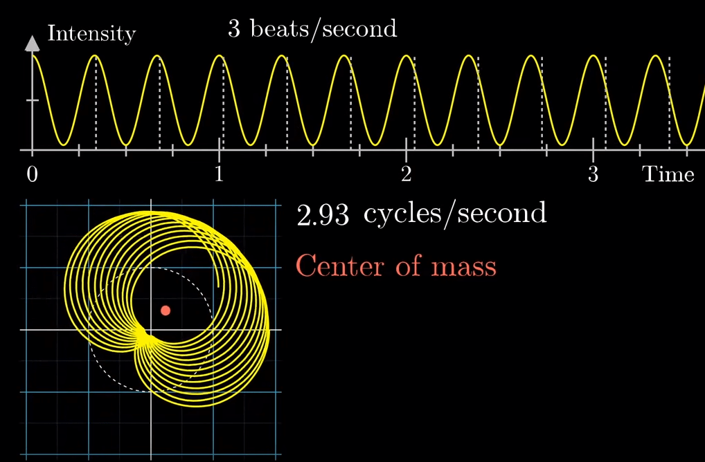 With a more intuitive and visual way, 3B1B come up with the beats/second and cycles/second frequency combination