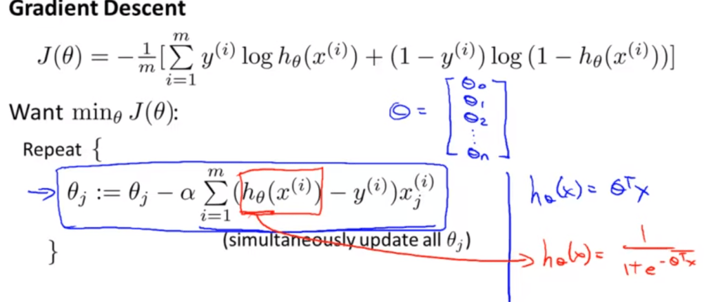 One can see it’s exact same as in linear regression but be aware that the ho(x) is Theta transposed time X vector in linear, while the logistic transformation of the same in logistic regression.