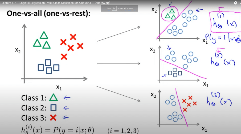 Along the same vein, we can apply the same approach to solve multi-classification problem by using one-versus- all(one-versus-rest) method, which goes through the binary logistic regression one by one: