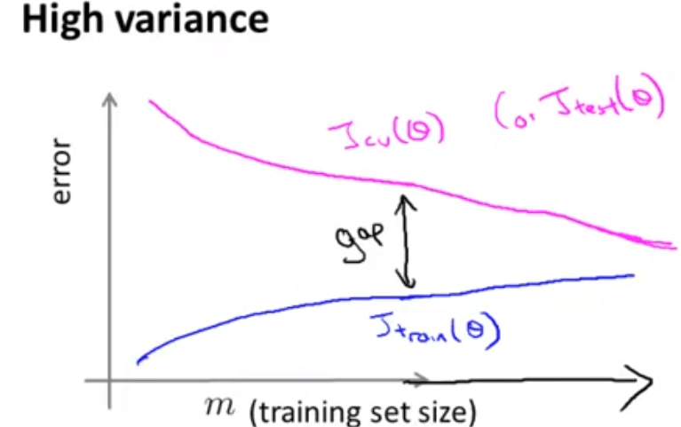 As prof. Ng mentioned, in real ML practice, you will need to decide if more training sample data is needed or modifying optimizing models is more necessary. Observing the learning curve of high biased and high variant cases:
