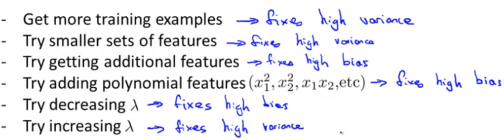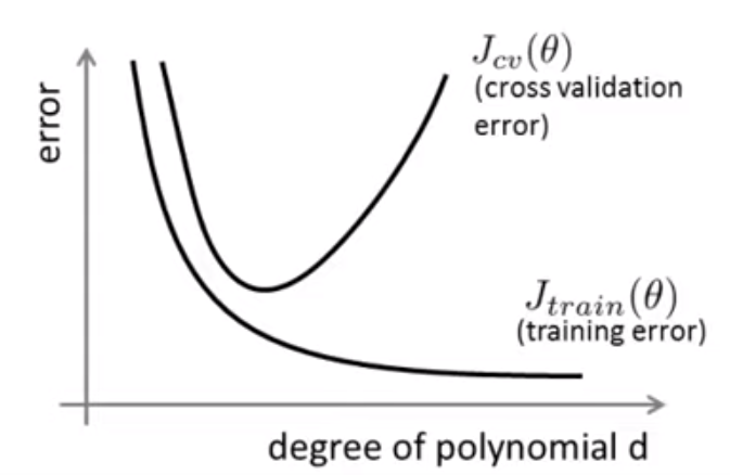 Intuitively and correctly, we should calculate the J function/cost function, which ever one that provides the minimal cost should be optimal. However, it’s well known in this arena that there are under-fitting(bias) and over-fitting(variance) problem. So apparently, the higher degree (variants) will lead up to a lower cost, which introduces over-fitting issue. The solution is to split the data set into three portions: test, cross validation and test set.