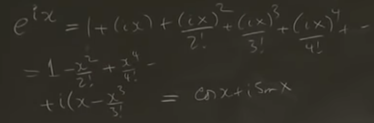 Plugging in x = pie, we get the famous most beautiful Euler’s equation: e^ipie + 1 = 0
