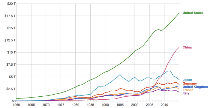 China’s economy has been booming in the last 40 years like a miracle. Reflecting on the GDP chart as below comparing to other big economic bodies: