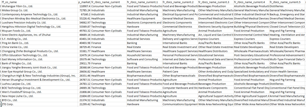 I filtered out the top 10 companies listed in Shenzhen (SHE), Shanghai(SHG) and Hongkong(HKG) markets.