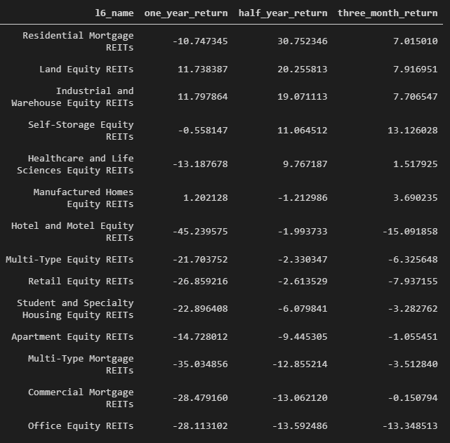 'Retail Equity REITs', 'Multi-Type Equity REITs', 'Office Equity REITs', 'Land Equity REITs', 'Hotel and Motel Equity REITs', 'Commercial Mortgage REITs', 'Apartment Equity REITs', 'Industrial and Warehouse Equity REITs', 'Healthcare and Life Sciences Equity REITs', 'Residential Mortgage REITs', 'Self-Storage Equity REITs', 'Student and Specialty Housing Equity REITs', 'Multi-Type Mortgage REITs', 'Manufactured Homes Equity REITs', 'Diversified REITs'