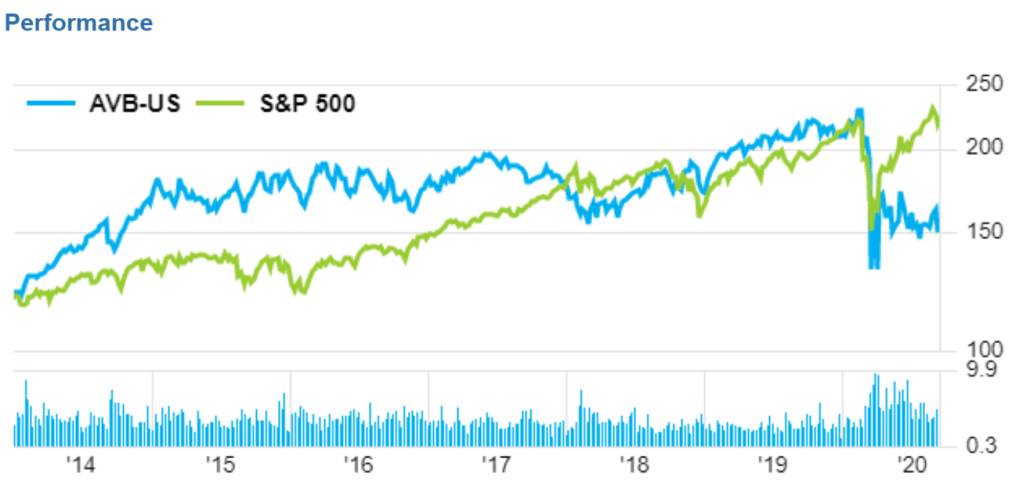 AVB-US Avalonbay Communities is down a lot, tumbled from 232 to 132 in the middle of march this year, then it fluctuates around $150 per share.