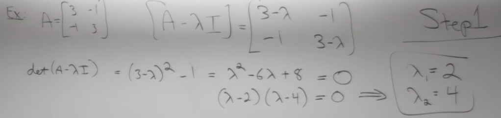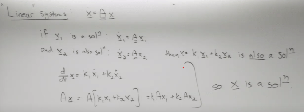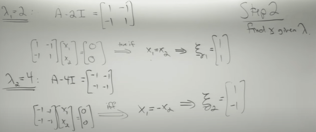 once we solve lambda, then place it back. then solve eigen vectors. Note that both lamba1 and lambda2 are written in the solutions as linear combination of the two, (get rid of elementary algebra that the solution is either lambda1 or lambda2), why? It’s due to the linear property of linear systems.