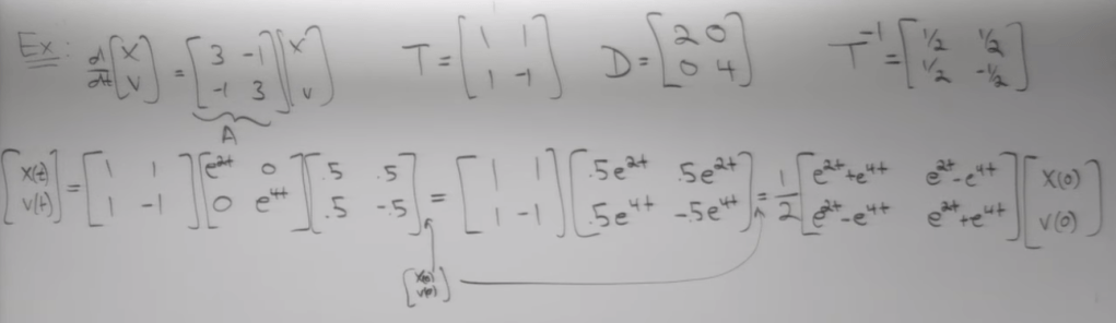 Using a simple example again, one should be able to compute T-1 either by hand or by computer, then solve the equation for X(t) and V(t):