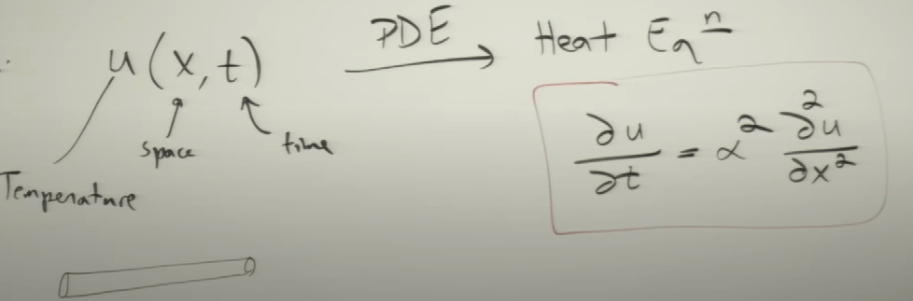 Partial Differential Equation(PDEs) is an equation relating a multivariate function and various partial derivatives of u. For example, heat equation u is dependent on it’s space x and time.