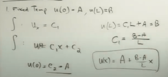 assume it reaches equilibrium, so Ut = 0, hence Uxx = 0, this is the Laplace equation in 1D space. it’s a simple derivative computation, we get Ux = C1, U = C1x + C2,