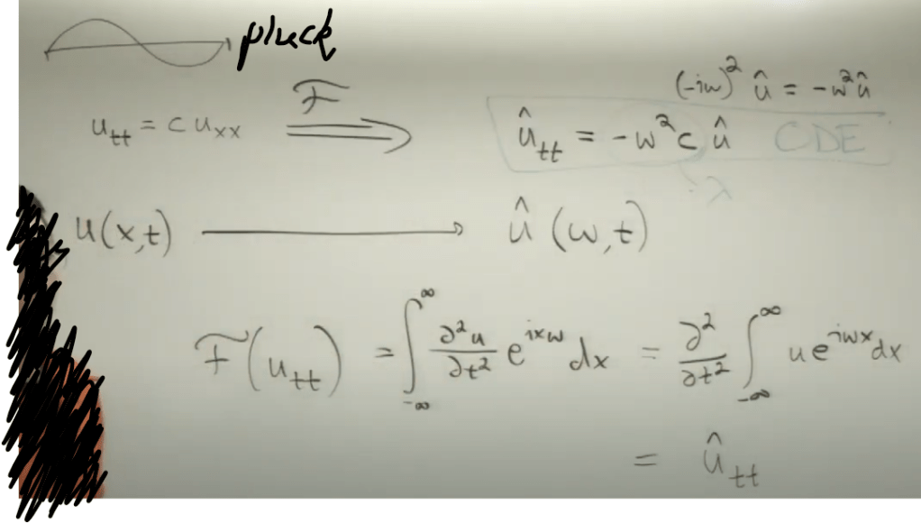 Lastly we need to use an example to illustrate how FT help reduce PDE problem to ODE problem, a toy example is to pluck a string Utt = c Uxx, then we apply the first important property of FT.