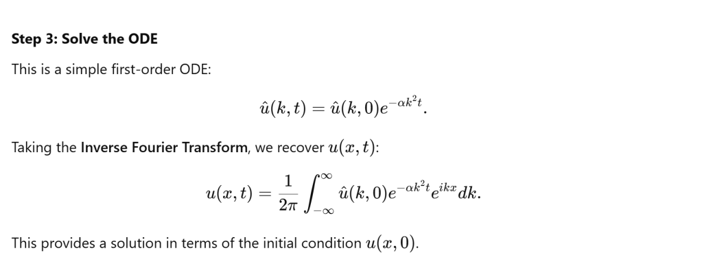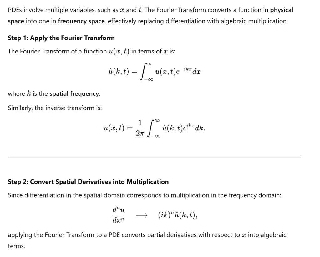 Fourier Transform helps reduce Partial Differential Equations (PDEs) into Ordinary Differential Equations (ODEs) by converting functions of multiple variables into functions of fewer variables. Here’s the intuition and step-by-step explanation of how it works: