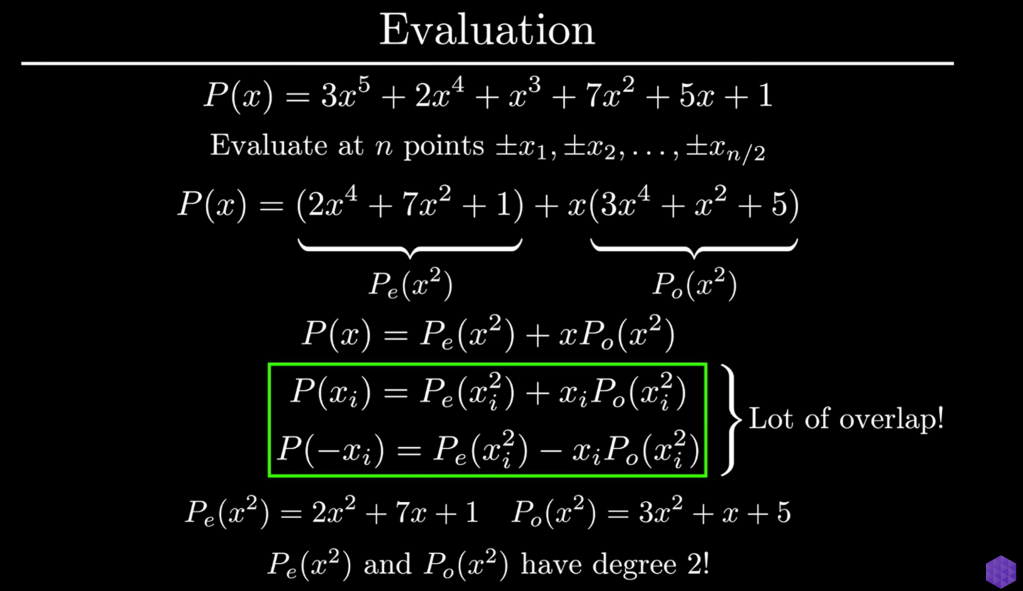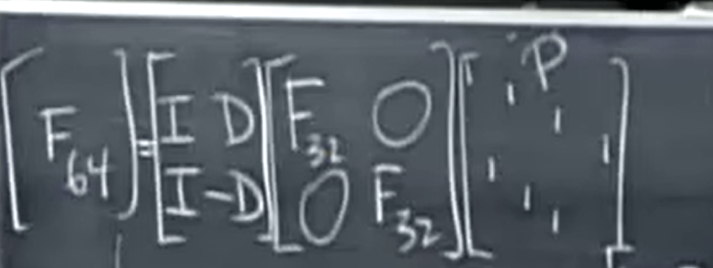 Smart mathematicians hundreds years ago was able to utilize FFT to do cumbersome polynomial multiplication, the key concepts are evaluation, interpolation (time domain to frequency domain), root of unity, recursive, domain expansion (from real Rn space to complex Cn space), pattern observation (odd and even both reducible to same and then can apply recursive algo). Big O n squared to Big O nlog(n). The ingenuity of reducing F64 to two F32 that was briefly stated by Dr.Strang is detailed here: