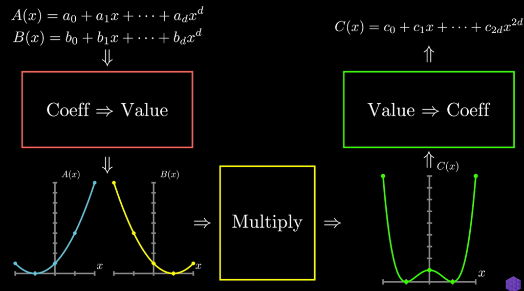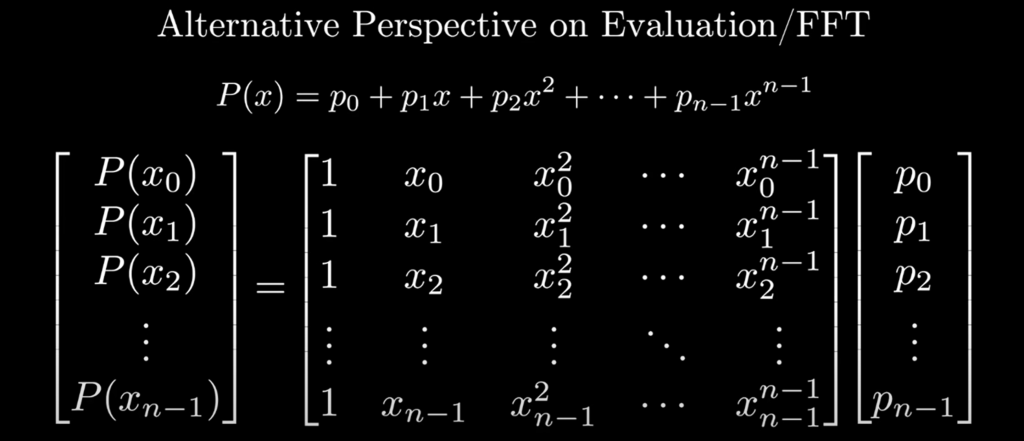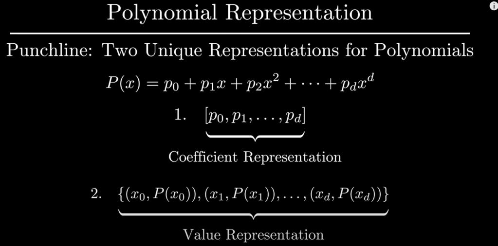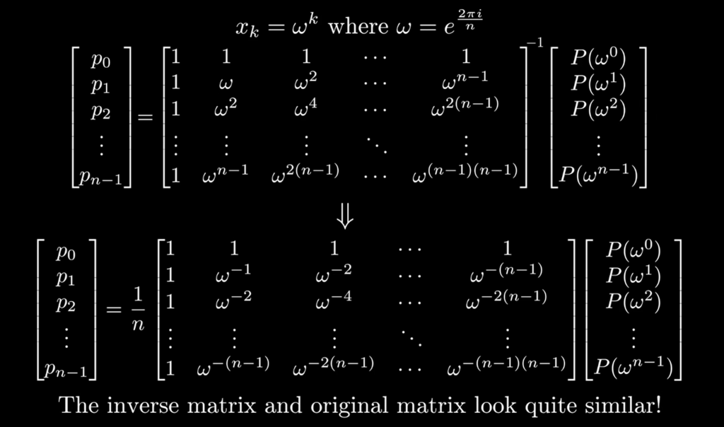 Here is the key connecting this polynomial computation to Fourier: the coefficient representation of polynomials is identical to Value representation. it’s like time domain FTed to frequency domain: