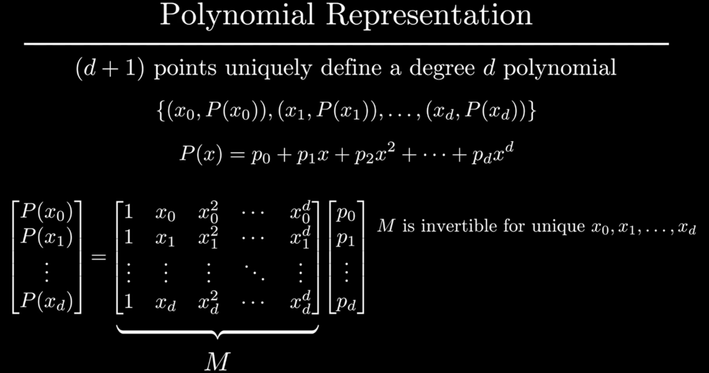 the crux explanation: any d degree polynomials can be represented by d+1 points. for any set of points there is a UNIQUE coefficient to represent the polynomial