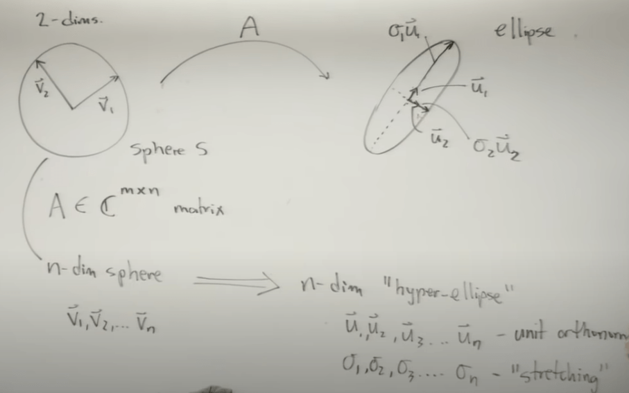 Extending to multiple vectors(n-dim sphere): note this n by n dimension of vectors V is a hard-to-understand part. To put in another way, the question is why v is a n by n dimensions. V is the underlying a group of orthonormal vectors that will be transformed by the matrix A as well as defined in forming/collecting matrix A, which is the columns/features. Because there are n features when the experiment designer decides to collect, the row number of V is n, on the other hand, each row is supposed to be a set of scalars with the number of scalars equivalent to dimensions, so n again. sf