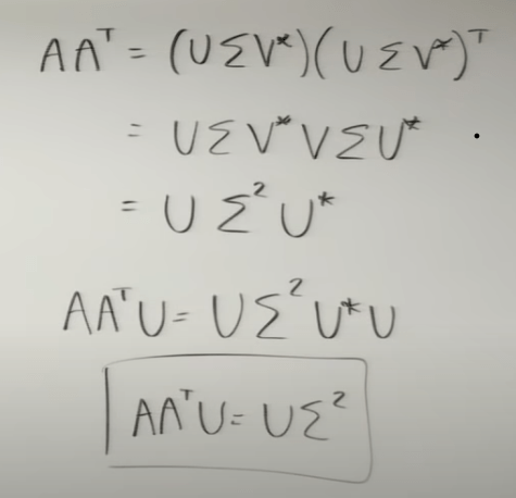 It becomes an eigen problem that can be computed for both sigma (square of sigma is lambda) and unitary vector set V. Transpose A on another direction, we get unitary vector set of U: