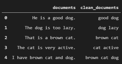 a1 = “He is a good dog.”a2 = “The dog is too lazy.”a3 = “That is a brown cat.”a4 = “The cat is very active.”a5 = “I have brown cat and dog.”df = pd.DataFrame()df[“documents”] = [a1,a2,a3,a4,a5]