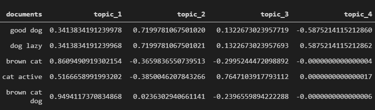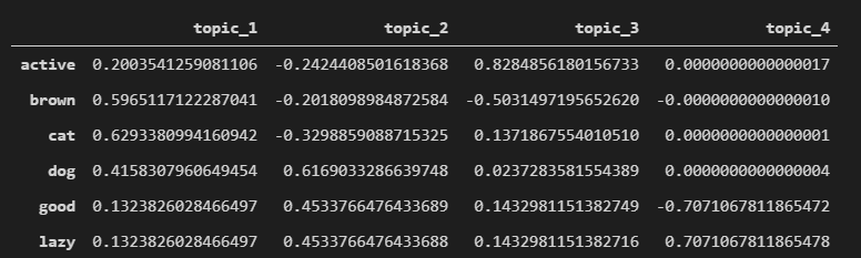 topic_encoded_df = pd.DataFrame(lsa, columns = ["topic_1", "topic_2", "topic_3", "topic_4"])