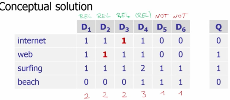 A rigid dot product between this term-document matrix and the query Q vector will cause the issue that “internet surfing” is missed for query of “web surfing”, human can see it quickly but not this rudimentary form of math/machine reading.