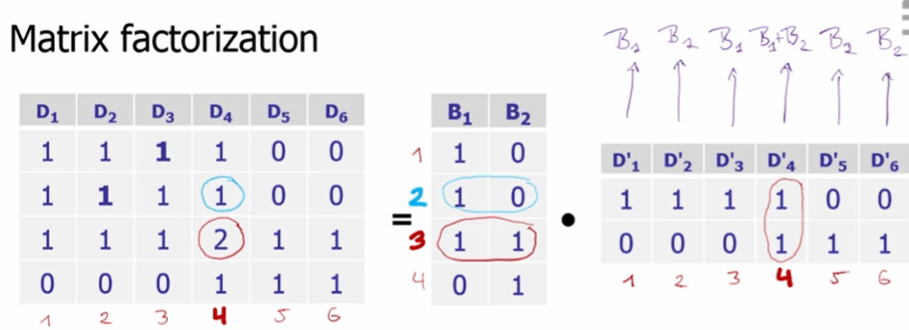 And here is the concept of “matrix factorization” where we come up with the two base vectors B1 and B2 standing for each underlying concept. The new Doc vector with apostrophe are representation of the original document D in the lower-rank concept space of B. Matrix factorized.