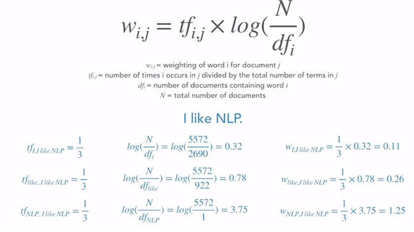 Hence if we convert word/phrase/document into vector form, we can easily compute word similarity/distance using above cosine similarity equation. The key in this approach is the very first step of vectorize the text by digitizing each word in it. Because frequently-used stop words such as “all, is, are…” do not actually convey features, TF-IDF(term frequency- Inverse Document Frequency) needs to be applied. TF-IDF’s concept is illustrated in the below equation and example of a simple sentence “I like NLP”
