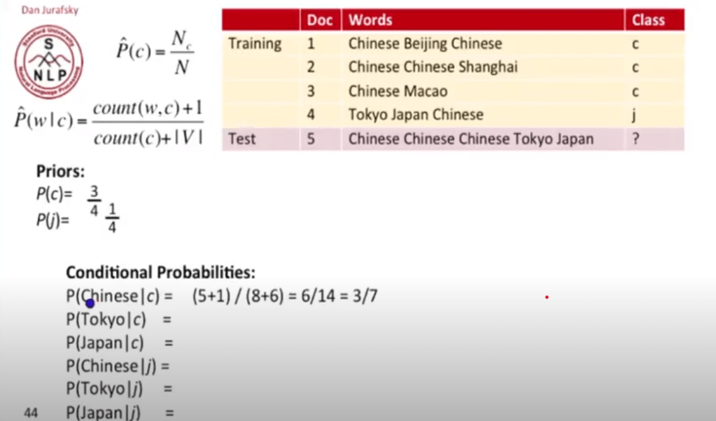 Now learning from Dan Jurafsky at Standford, I expand my understandin of Naive Bayes on NLP. The goal is to figure out the probability of a document being classified based on a particular document