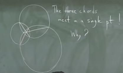 The following three circle cross each other forming common chords in between, question is whether the three always meets at the center single pt? answer is yes, and question is why?