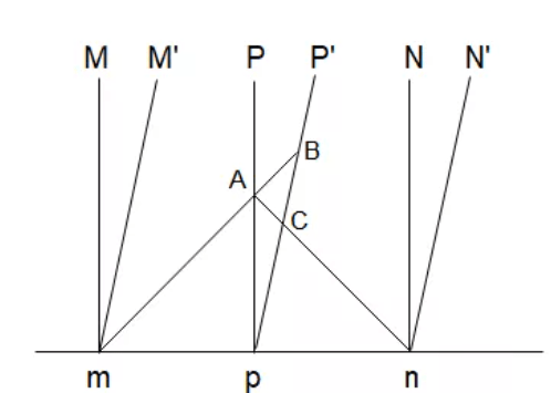 From the view of a person on the ground, she see the lightening happened concurrently at A, while fro the view of a person in the middle of the train, light from the head car comes in at time C, and then she can see the light from the end car come in later at time B.