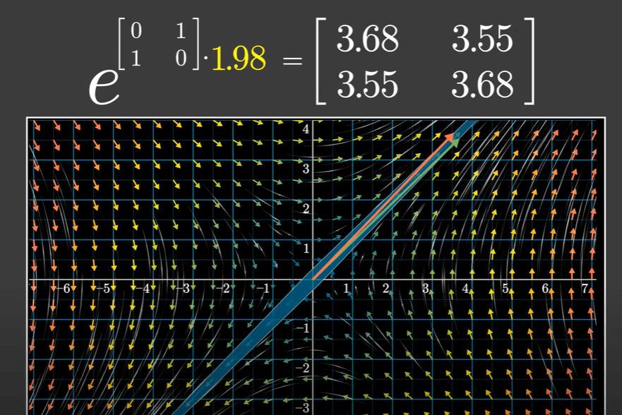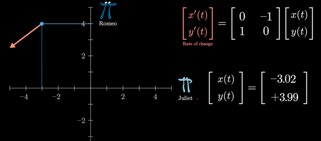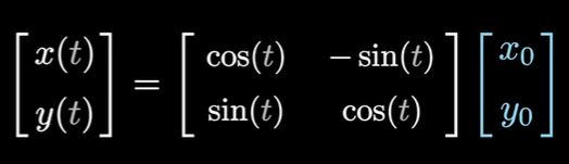 Applying a traditional mindset to try to solve x and y equations respectively is not easy. One can do lot’s of guess/trial and a savvy mathematician may jump to cos sin equations correctly, but it is not generic and just too stretching. Matrix provides a holistic perspective in that we can picture at certain moment the status of x and y can be described using vector, so in the following, we can draw the original positional vector, dissect to it’s x and y axis, we get the derivative vector (orange vector line):