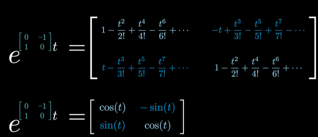 It requires a little geometry and analytical equation bridging savviness to deduce from e^(Mt) to the cos sin matrix