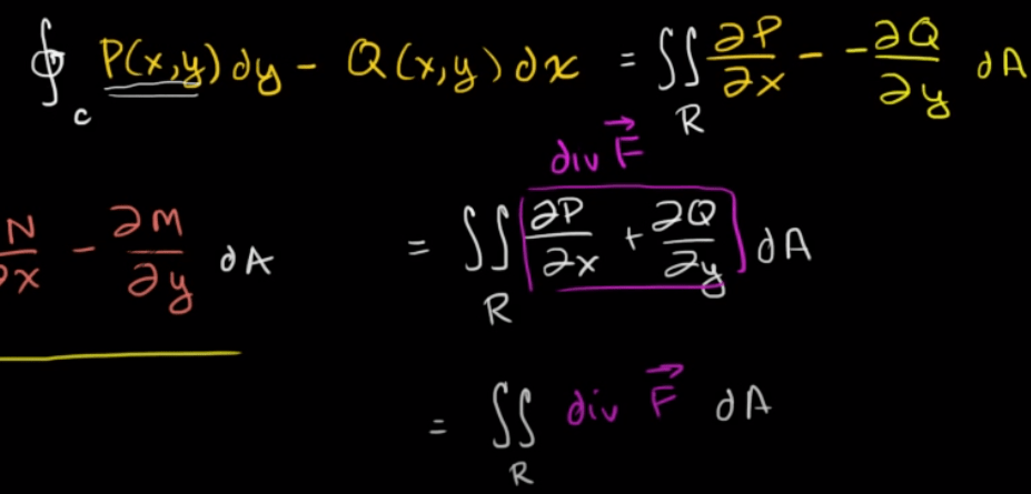 Next, Green’s theorem, basically says that path integral on a vector field can be calculated as the subtracting Q (j part) derivative on x( or i direction) and P(i part) derivative on y(or j direction) integrated on the region.