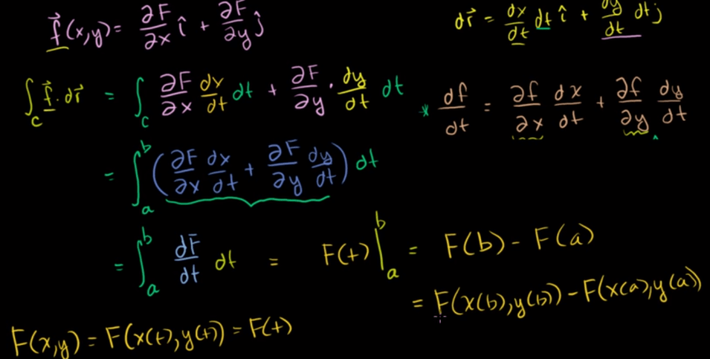 This is reminiscent of the two-dimensional area calculation problem, you can approximate by adding tiny rectangles with infinitesimal width, but the accurate approach is to find it’s integral and take F(b) – F(a). One caveat is that in that simple case, the notion of “conservative” does not exist, while in line integral in vector field does. Expanding on physics, lots of fields such as energy, momentum are conservative.