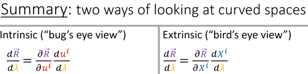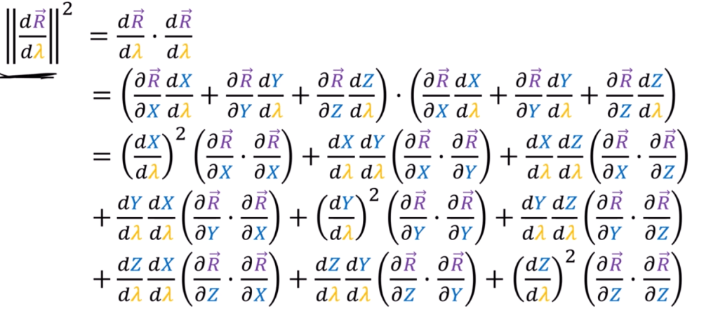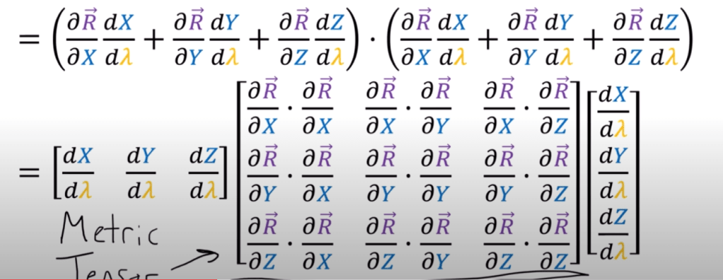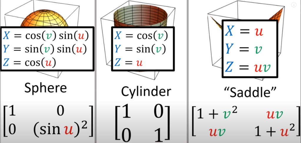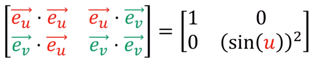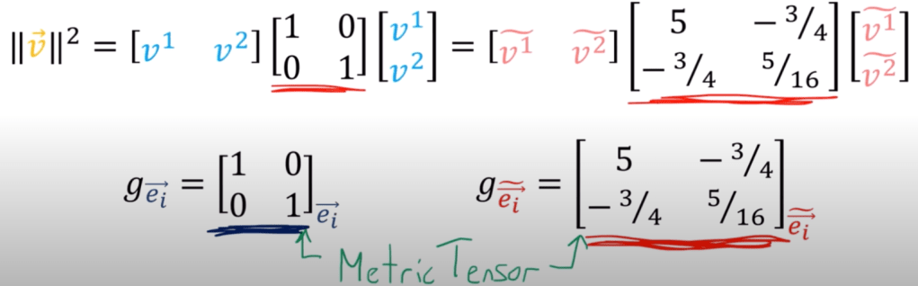 Meanwhile, the notion of “metric tensor” jumps out of its meaning and importance here. Instead of a stable identical matrix for 2D space, in 3D space or multi-dimensional space, “metric tensor” matrix is essential to grasp measuring: