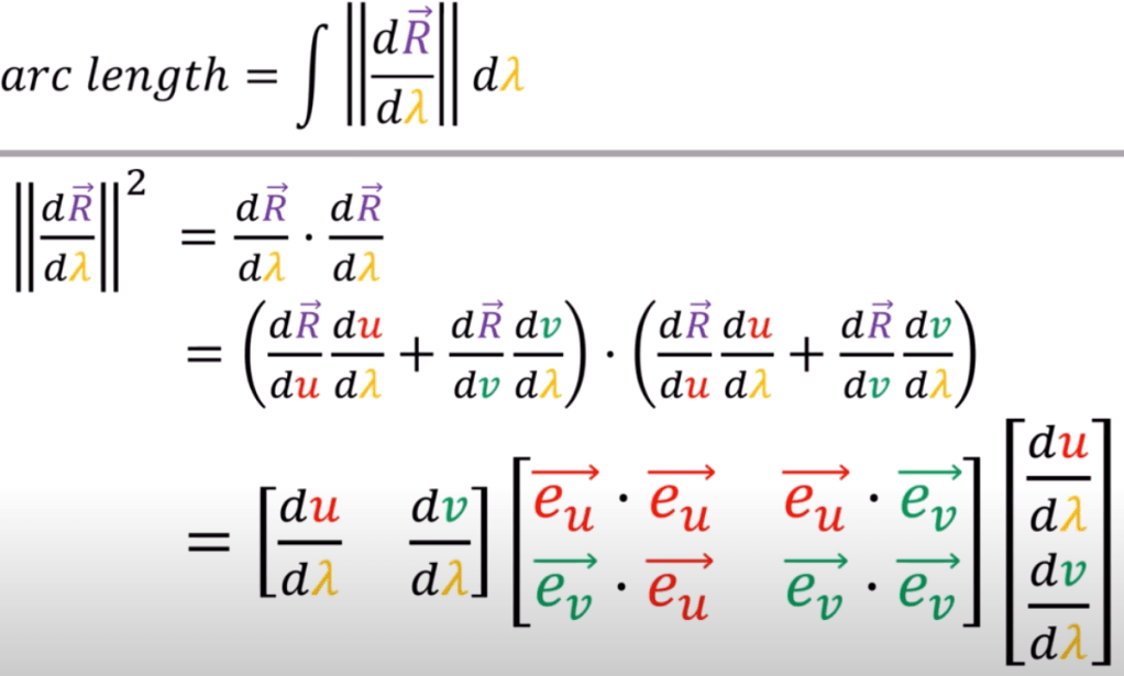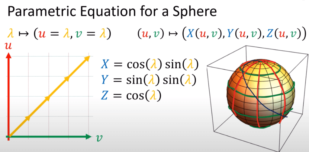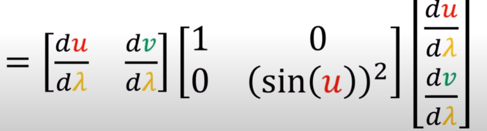 So, let’s measure an arc length at a 3D sphere, note what we learned in multivariable calculus about parameterization is all useful now given it’s converting between two component space and three-component space.