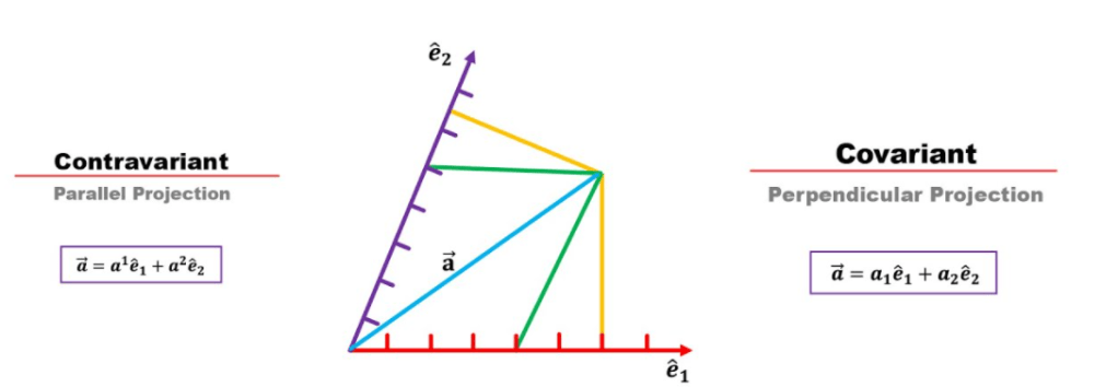 However, geometrically, what is the the visual? as can see from below, contravarient is the parallel projection, while covarient is the perpendicular projection. Note it doesn’t dictate that a sub equals a sup, because it’s two different logic in drawing/reaching/defining vector a here.