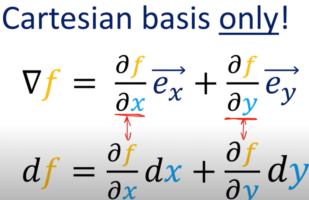 in Cartesian system, it simplifies, hence causing a delusion/distorted understanding that the below two – del f and d f are same