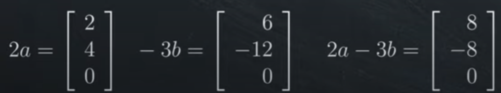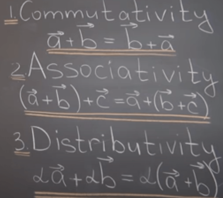 Vectors operates with three properties, commutativity, associativity and distributivity.