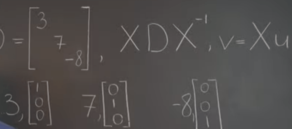 Finally, to learn all these tricks of finding eigen value and vector, what’s the purpose? can we go reversely, meaning from known eigen value and vector to restore the original matrix? At least for the simplest form – diagonal matrix, it’s easy to restore; then the similarity transformation of the D matrix, since v = Xu, we can deduce the eigen vector is the columns of the X, while eigen value is same as D.