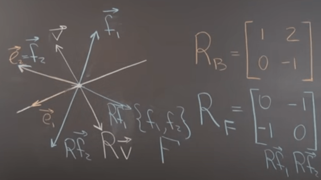 The beauty is that if we choose different basis system, the reflection matrix Ar or Rb(later on the author change the symbol, stating Rb is more accurate), for example, here is a new basis system F instead of B: