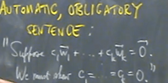 It’s vital to write this automatic obligatory sentence that suppose c1w1 + … + ckwk = 0, we say that if c1 = c2 = … =0 makes it the most efficient. Hence it’s easier to understand/prove the theorem: