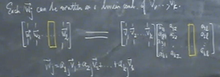Since w vectors live in the same space Rn composed of v vectors, we can try to express w vectors(left) using the composition of v vectors(Right, apply column operation)