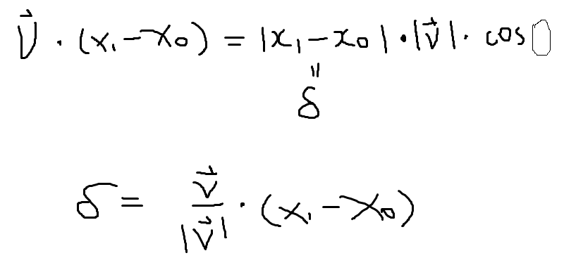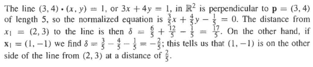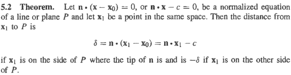 On the other hand, if given the plane and a vector p, and a random point x1 or x2, we can use a normalized equation to find the distance, measured perpendicularly, from a point to a line or plane, as is shown below the delta.